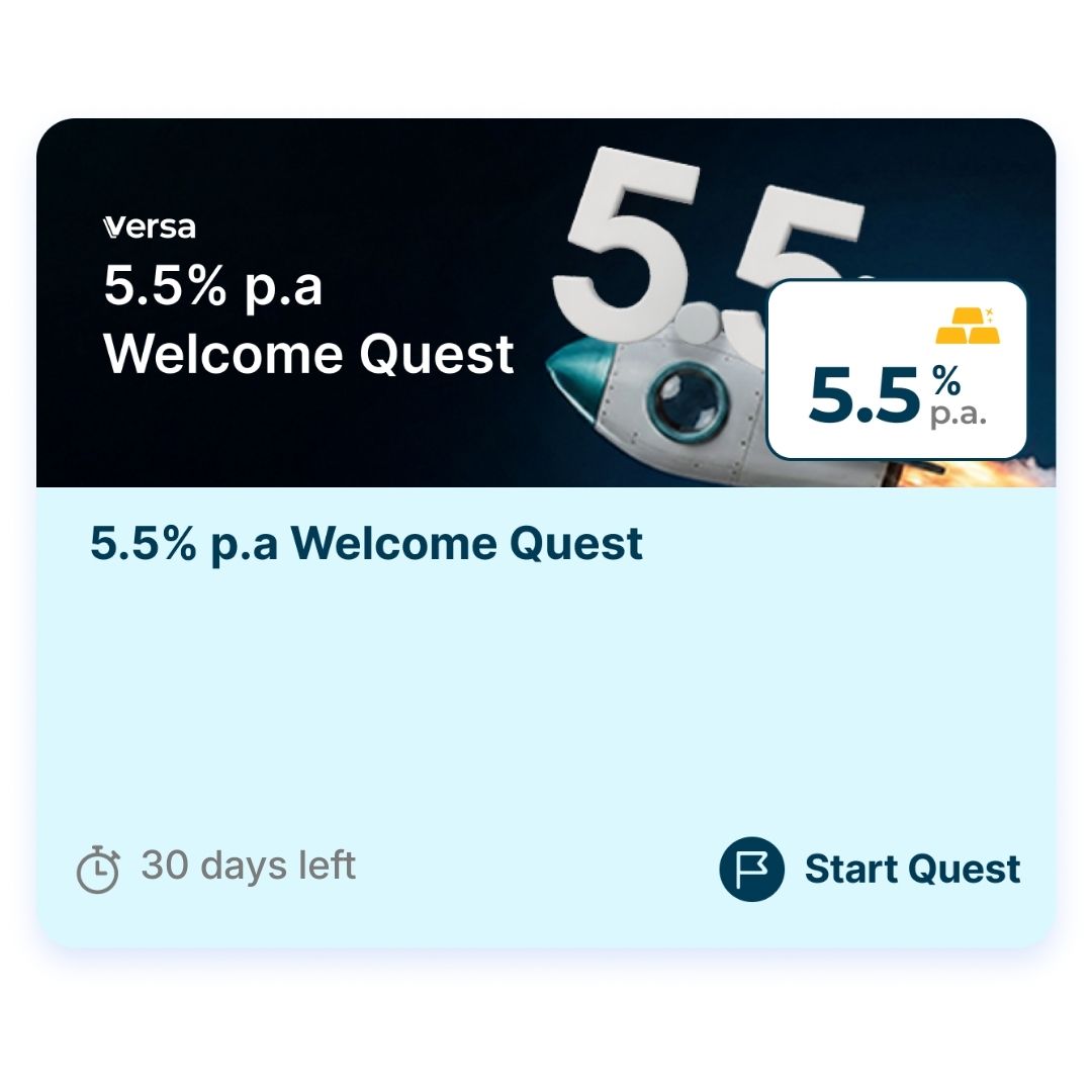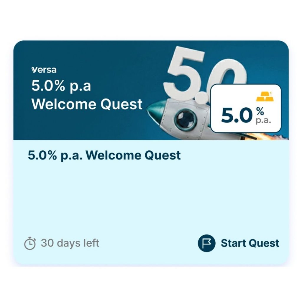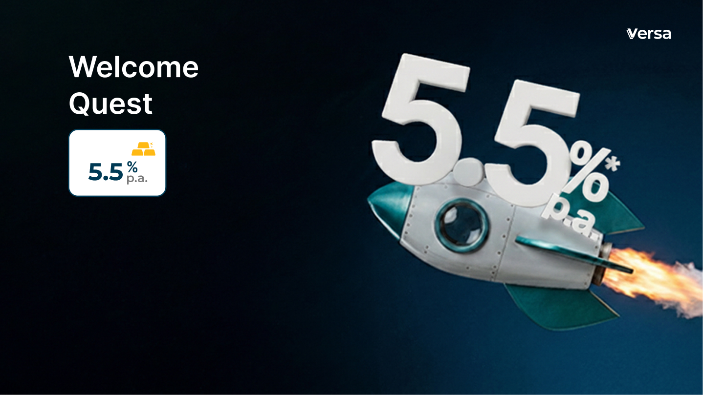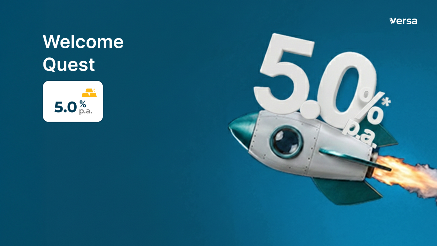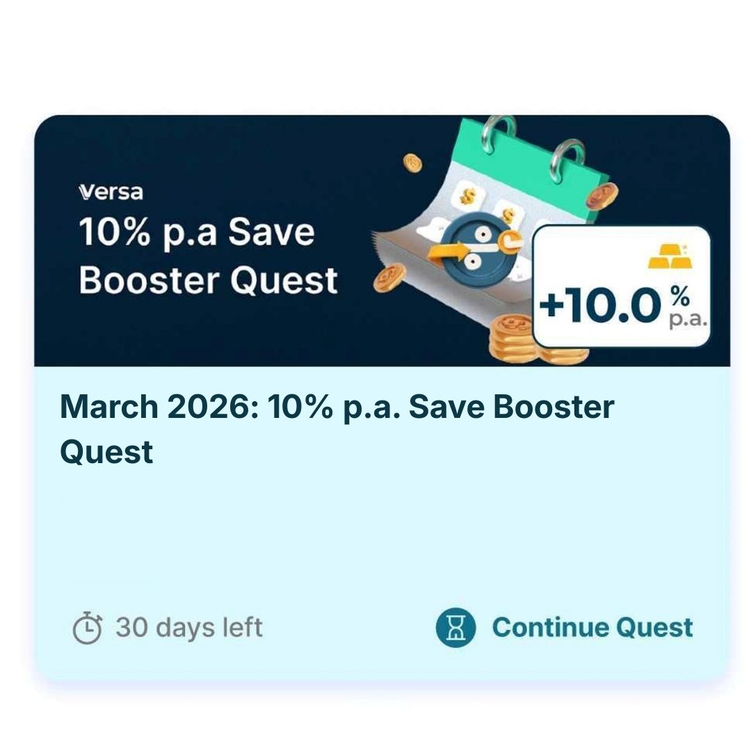 Welcome to Versa! If you sign up between 1 March and 31 March 2026, Versa will help you build strong money habits right from the start of the year. By participating in this quest, you can earn up to 5.5%* p.a. fixed promotional rates on your fresh funds for 30 days, and you can boost your earnings to 10%* p.a. when you save every month.