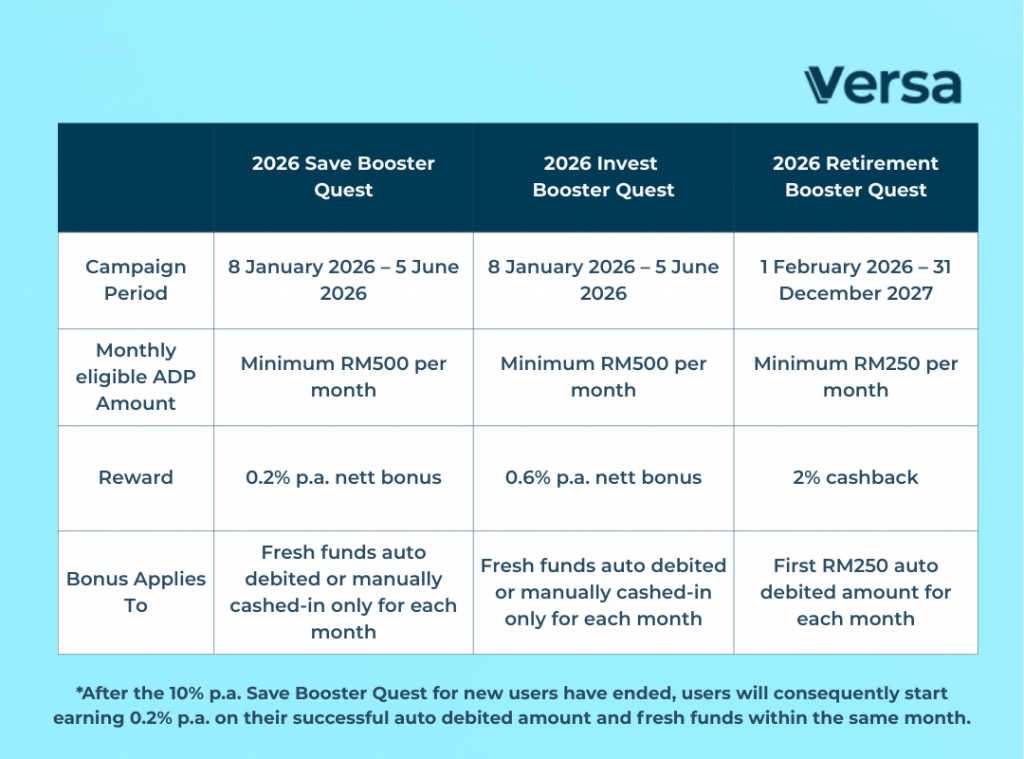 💡Pro Tip: To make the most out of this quest, complete auto debits worth RM500 or more each month. Ensure your auto debits are successfully processed every month. Then, cash in fresh funds to maximize your returns on the booster ratewithin the same month. Repeat this healthy habit consistently throughout the year 2026, and let Versa reward your commitment.