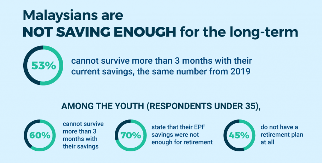 Looking at these statistics and the spending habits of Malaysian millennials, it may not come as a surprise that Malaysians are not saving enough. Based on RinggitPlus’ Financial Literacy Survey from 2020, many Malaysians do not have enough savings to last them more than 3 months. RinggitPlus reported there was little improvement in the results from the previous year indicating that year after year, Malaysians are still not well-aware of the importance of saving money.
