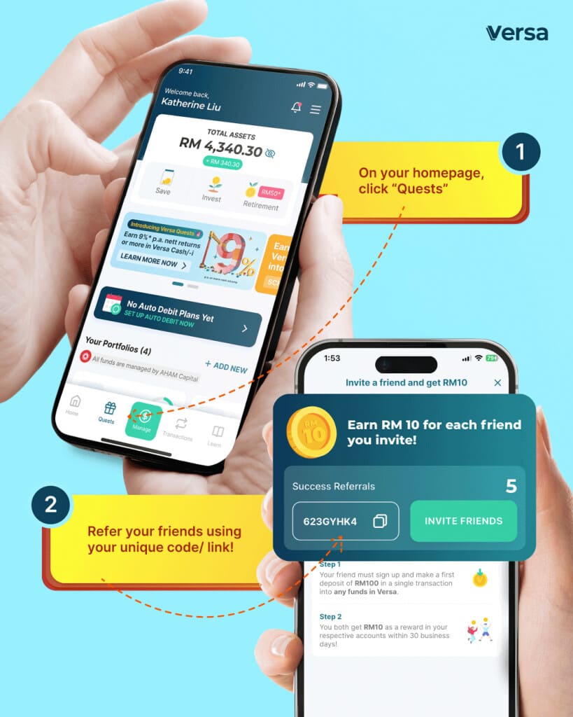 Note: The referee’s account must be duly verified and approved by Versa, using the referrer’s unique code or link. - Step 3: Ensure your referral keeps the minimum amount of RM100 invested without cashing out nor switching out until the final selection of winners of this Campaign.