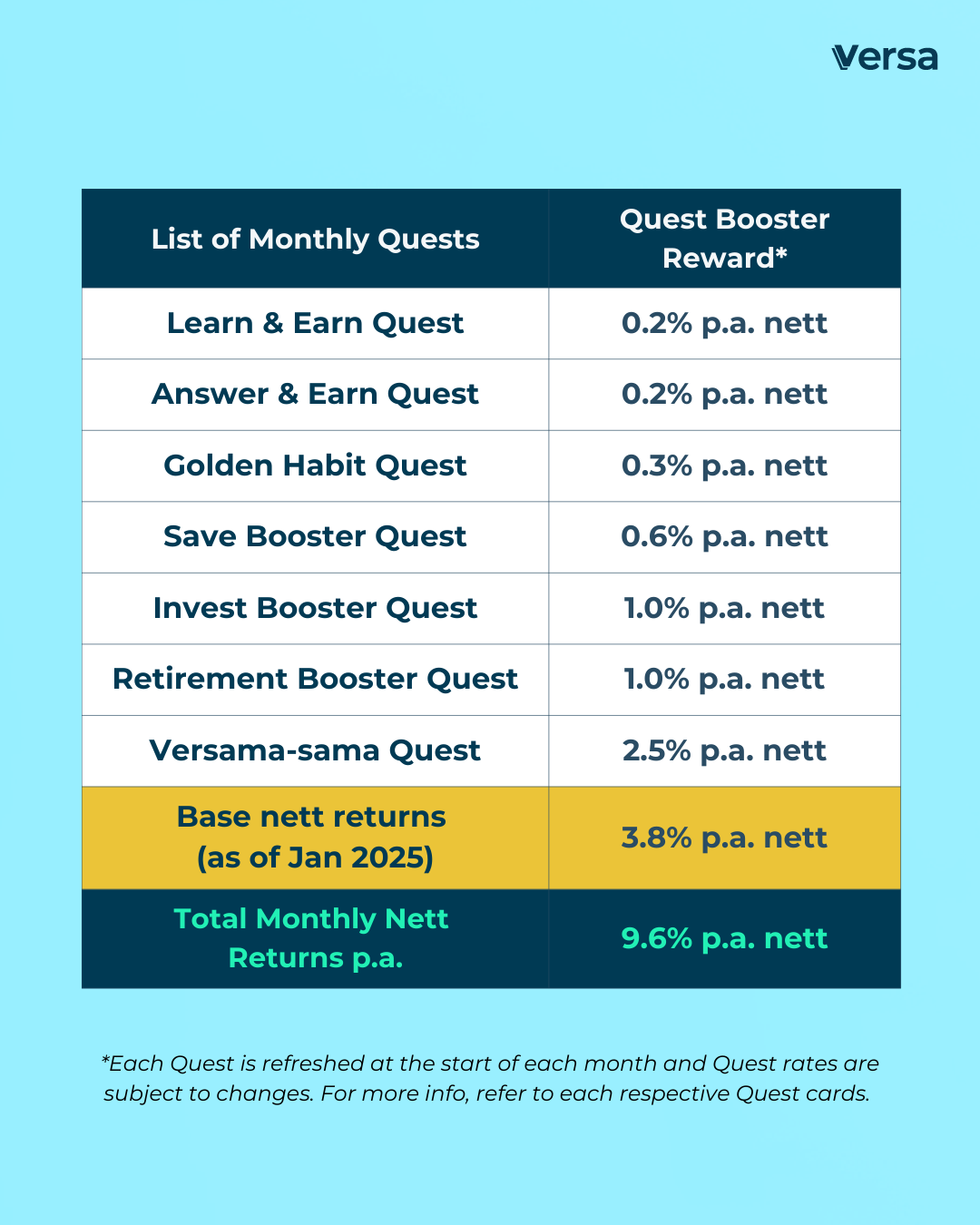 By completing any of these Quests, you’ll be eligible to stack and earn 9%* or MORE nett booster in Versa Save! Find out more here: Stack and earn 9%* p.a. or more nett booster with Versa Quests!