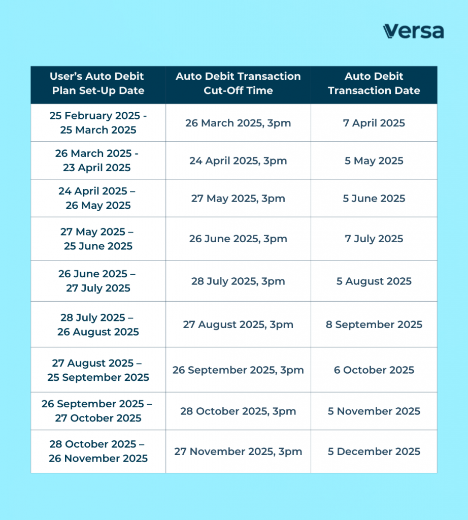 Your auto debit amount will be deducted from your bank account on the 5th of every month. For non-Maybank users, the deduction may take place on the next working day if the 5th is a public holiday or weekend. Your funds will be deposited into your chosen Versa fund within 2-3 business days.