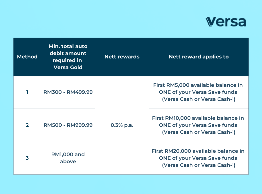 • min. RM300 into any Versa Save funds to earn +0.3% p.a. nett in Versa Save