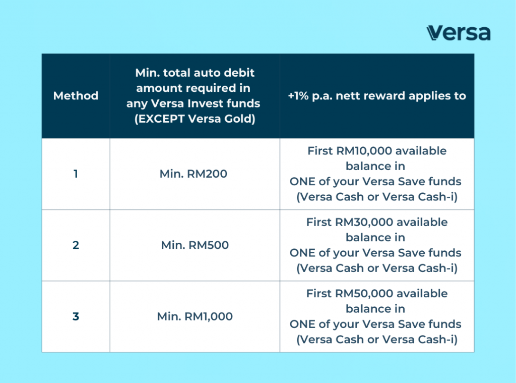 • min. RM300 into any Versa Save funds to earn +0.3% p.a. nett in Versa Save