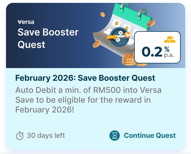 - Step 3: During the Eligibility Period, set up a monthly auto-debit of minimum RM500 into any Versa Save products via the Save Booster Quest under the ‘Quests’ tab. The 10%* p.a. bonus is applicable on the first RM500 auto-debit amount, if you set up auto-debit plans by 26 March 2026.
