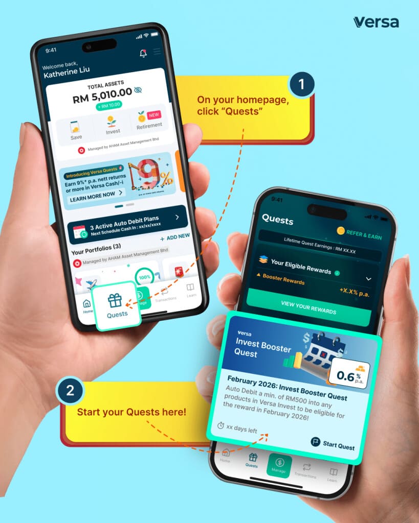 - Step 3: During the Eligibility Period, set up a monthly auto-debit of minimum RM500 into any Versa Save products via the Save Booster Quest under the ‘Quests’ tab. The 10%* p.a. bonus is applicable on the first RM500 auto-debit amount, if you set up auto-debit plans by 26 March 2026.