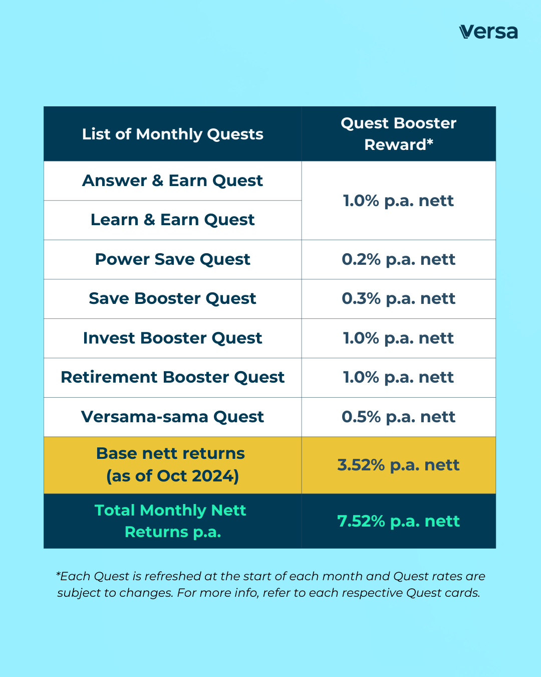 By completing any of these Quests, you’ll be eligible to stack and earn 7%* or MORE nett returns in Versa Save! Find out more here: Stack and earn 7%* p.a. or more nett returns with Versa Quests!