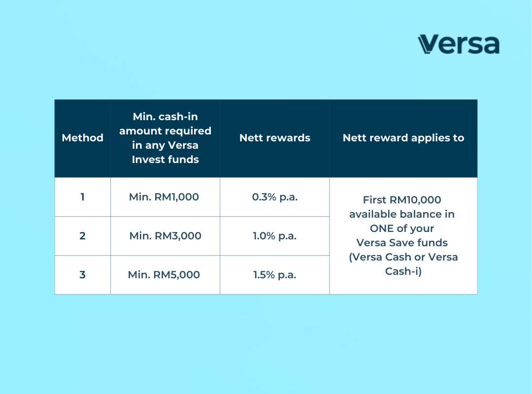Earn up to +1.5% p.a. nett returns when you successfully cash in a min. of RM1,000 / RM3,000 / RM5,000 of fresh funds in a single transaction into any Versa Invest funds.