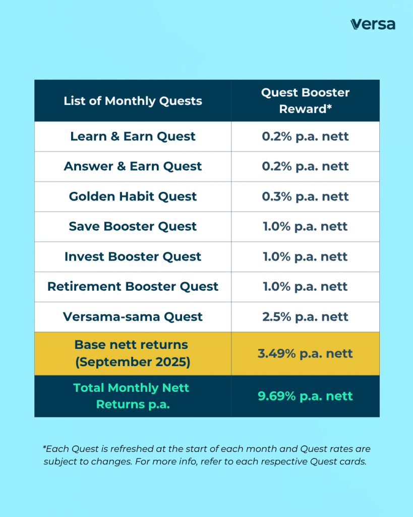 By completing any of these Quests, you’ll be eligible to stack and earn 9%* or MORE nett returns in Versa Save! Find out more here: Stack and earn 9%* p.a. or more nett returns with Versa Quests!