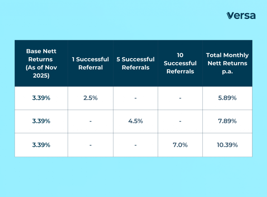 Note: Each month, the Versama-sama Referral Quest reward will reset to 0%. To earn +0.5%* p.a. nett booster or more, find friends and start referring them to Versa successfully this month!