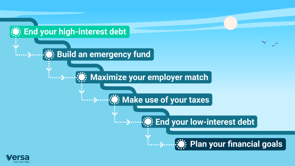 The waterfall method can help you prioritize by explaining where your money should go first, and then where any extra money should go. Bonus: this method is perfect for planning your retirement.